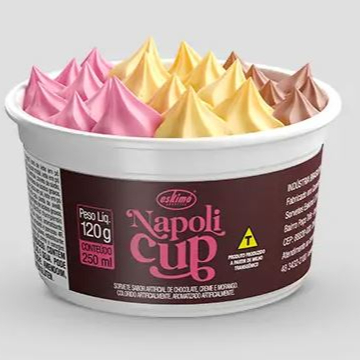 Sorvete sabor artificial de creme, chocolate e morango. Aromatizado artificialmente. Colorido artificialmente.