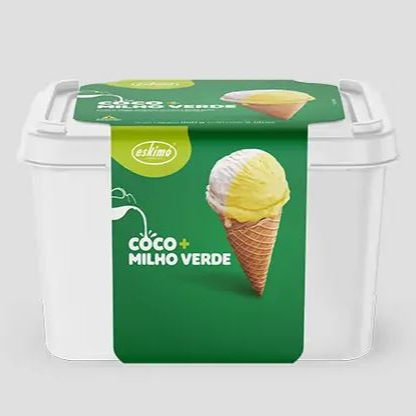 Sorvete sabor artificial de coco e milho verde. Aromatizado artificialmente. Colorido artificialmente.