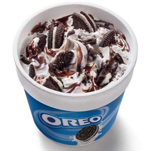 Com um cremoso sorvete expresso e cobertura a sua escolha, + tubetes eo Oreo.