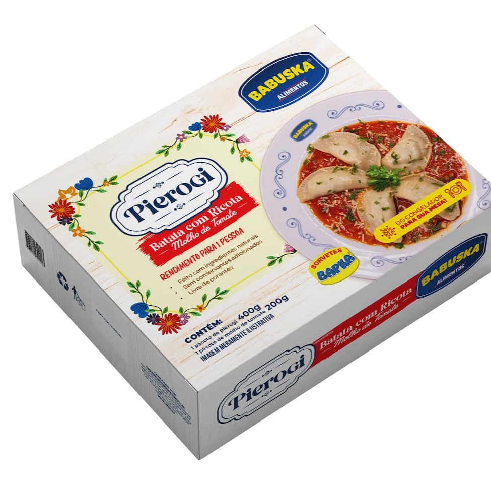 Modo De Preparo: Pierogi: Em uma panela com 5 litros de água fervente, acrescente o Pierogi congelado. Após 8 minutos, retire da água e reserve. Sugestão De Preparo: Frite o Pierogi ainda congelado em óleo ou gordura quente. Molho: Transfira o molho para uma panela e aqueça em fogo médio até atingir a fervura. Acrescente ao Pierogi reservado. Ingredientes: Tomate, farinha de trigo enriquecida com ferro e ácido fólico, batata, ricota, água, extrato de tomate (tomate, sal e açúcar), ovo, cebola, margarina (bacillus thurigiensis, streptomyces viridochromogenes e agrobacterium tumefaciens), sal, alho e especiarias. Alérgicos: Contém Leite, Derivados De Leite, Trigo E Soja. Pode Conter Centeio, Cevada E Aveia. Contém Lactose. Contém Glúten.