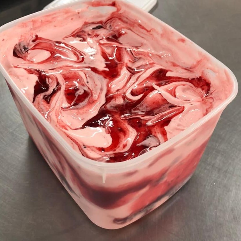Sorvete de massa sabor baunilha, com polpa de morango e suspiros.