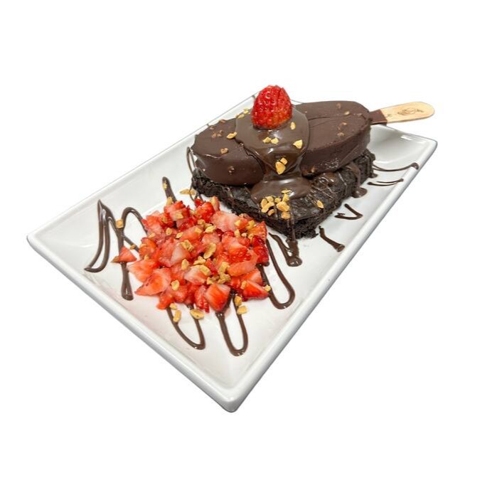 Apresentamos o 'Gran Brownie Nero', uma sobremesa magnífica da nossa categoria de doces. É uma deliciosa combinação do nosso Brownie tradicional, incrivelmente macio e rico em sabor de chocolate, acompanhado pelo refrescante Picolé Nero, que oferece um contraste perfeito. Acrescentamos ainda uma generosa porção de morangos suculentos, que trazem uma leve acidez para equilibrar o paladar. A calda de chocolate de alta qualidade e o creme de avelã, incrivelmente cremoso, envolvem cada pedaço com uma camada extra de prazer. Essa sobremesa é verdadeiramente uma experiência incomparável de sabores e texturas.