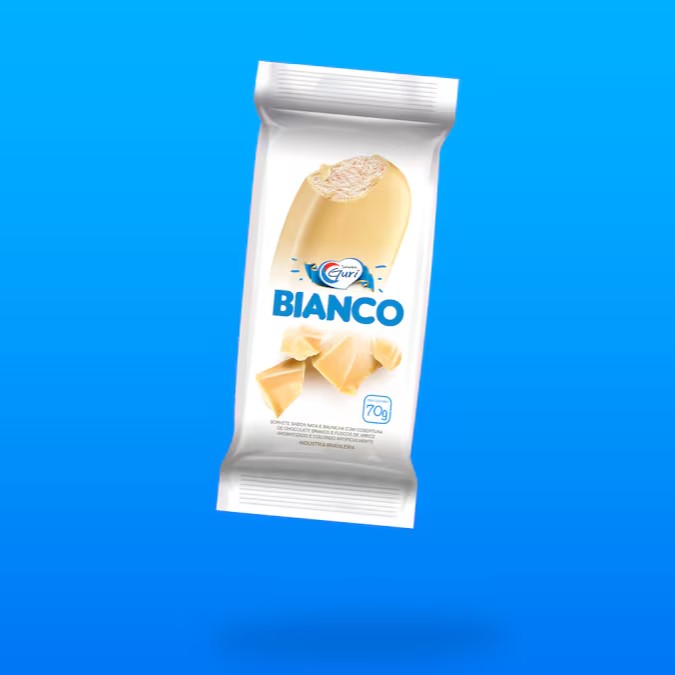 Picolé sabor chocolate branco e baunilha com cobertura de chocolate branco.