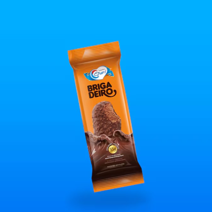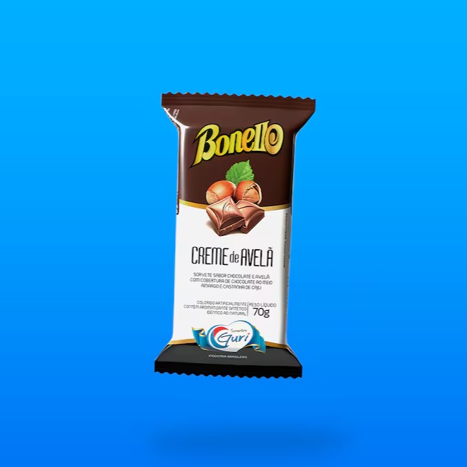 Picolé sabor chocolate e avelã com cobertura de chocolate meio amargo.