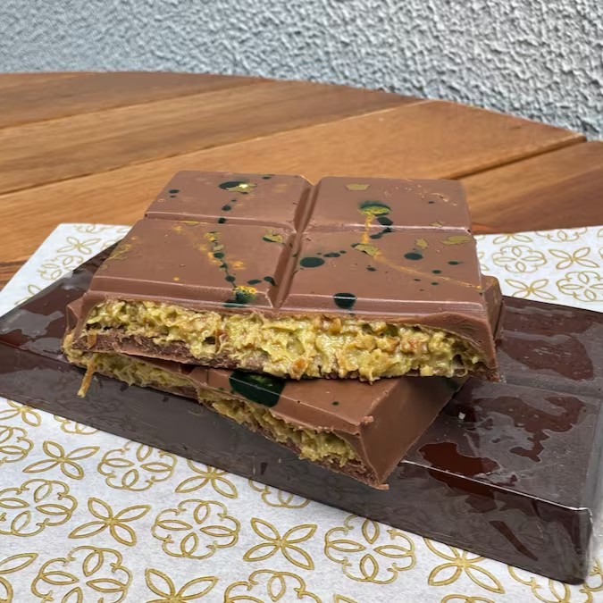 Chocolate Belga ao leite 33%, com crocante de pistachella (aprox. 115g). Embalagem: em saquinho plástico. Caso deseje sacola para presente favor adicionar nos complementos.