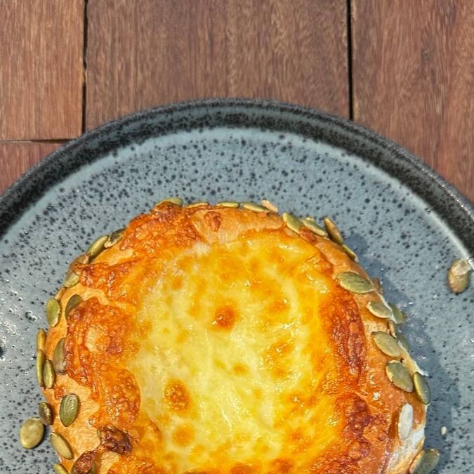 Pão muito macio, massa do brioche, bem amanteigado, com cream cheese, mozarela e sementes de abóbora.