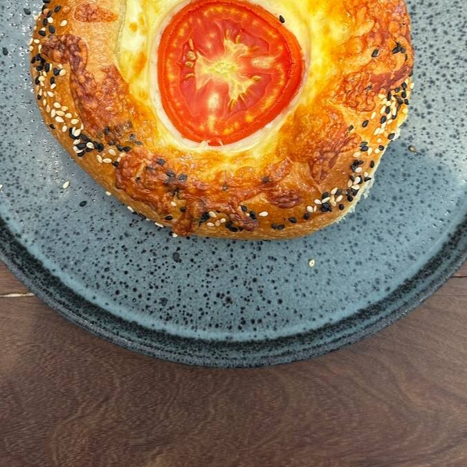 Pão muito macio, massa do brioche, bem amanteigado, com cream cheese, mozarela, uma rodela de tomate e gergelim.