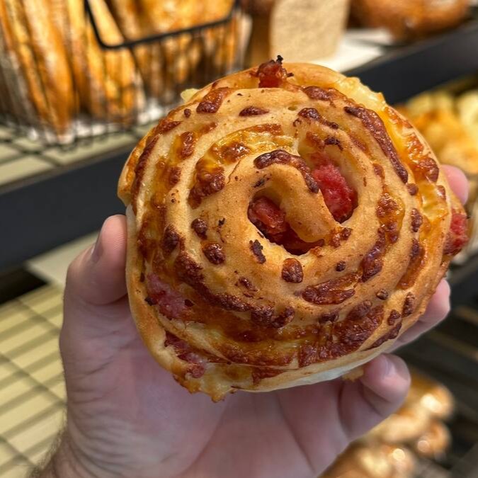 Pão doce, igual ao utilizado no Cinnamon Rolls, mas recheado com mozarela e linguiça Blumenau!