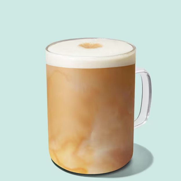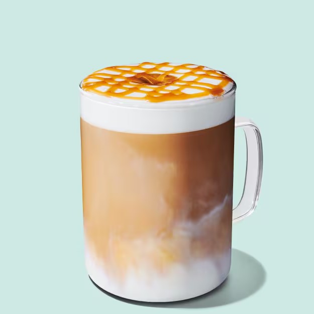 Leite vaporizado com um toque de baunilha, dose de espresso e cobertura de caramelo.