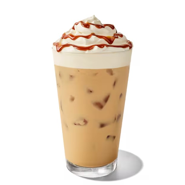 Leite, gelo, um toque de baunilha, dose de espresso e cobertura de caramelo.