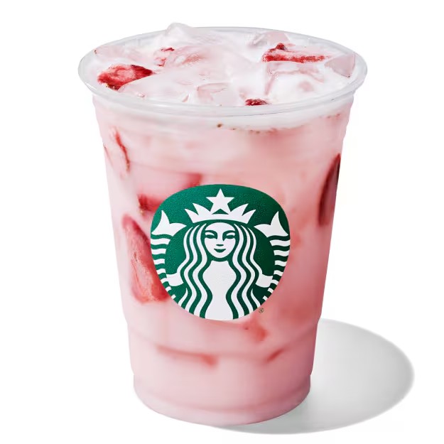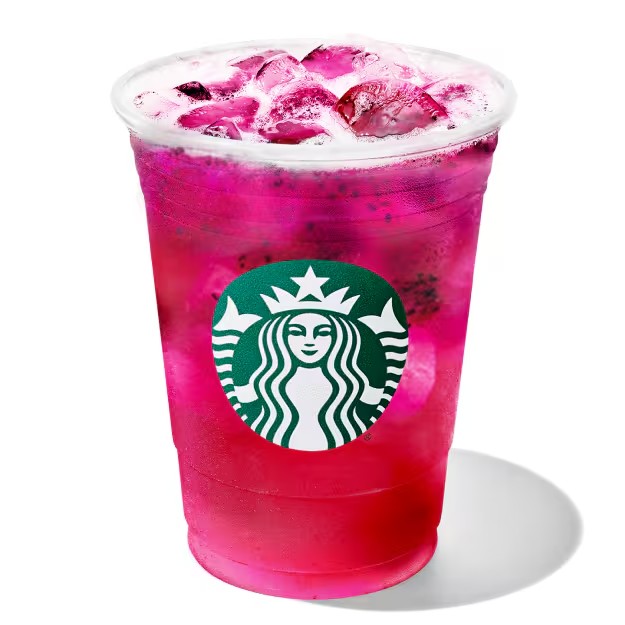 Combina limonada com o xarope de morango, base cremosa do Frappuccino® e as frutas liofilizadas de Pitaya com gelo batido.