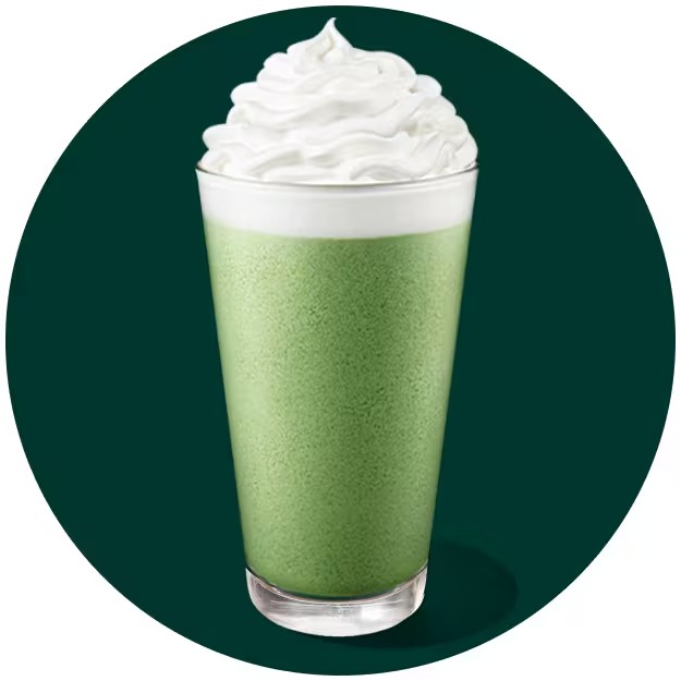 "Frappuccino na base café, leite, mocha branco, xarope de pistache e gelo batido. Finalizado com chantilly de baunilha.