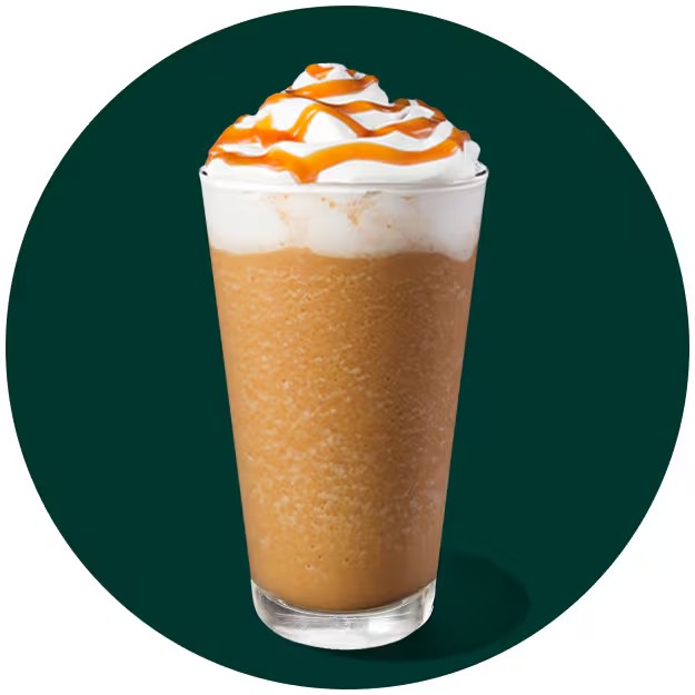 Frappuccino na base café, leite, xarope de caramelo, batido com gelo e leite, finalizado com chantilly e cobertura de caramelo. *O chantilly pode derreter durante a entrega.