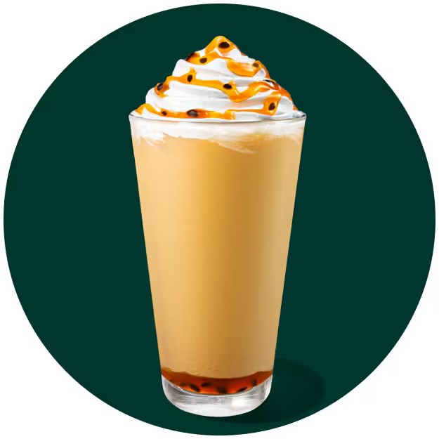 Leite, base de creme, calda de maracujá e gelo batido. Finalizado com chantilly de baunilha e cobertura de maracujá com semente