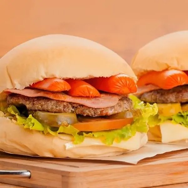 Dois Hambúrguer artesanal de costela de 120g cada, duplo queijo nos dois, alface tomate e cebola roxa, molho especial e maionese da casa, td servido no pão quentinho.