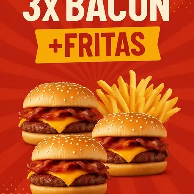 3 X-Bacon HambúRguer Prensado De 56g, Queijo, Alface E Tomate, Maionese Artesanal, bdelicioso bacon em tirar, queijo provoloneTudo Servido No PãO Quentinho + Batata Frita. acompanha adicional de maionese da casa.