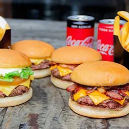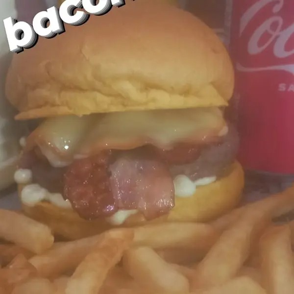 Combo Bacon + Coca cola 200ml + ;batata Delicioso hambúrguer artesanal de 120g, Bacon em fatias, duplo queijo, maionese da casa, tudo servido no pão quentinho, + coca caso você queira outro refrigerante que colocar em observação, se estiver disponível e nós mandamos p vc