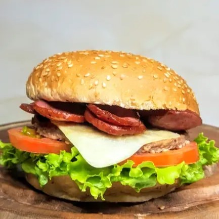 HambúRguer Prensado De 56g, Bacon Em Fatias Presunto, Queijo Mussarela, Cheddar, Batata Palha, Alface E Tomate, Maionese Artesanal, Tudo Servido No PãO Quentinho.