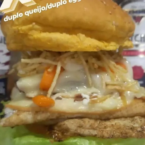 HambúRguer Prensado De 56g, Dois Ovos Com Queijo Mussarela, Presunto, Cheddar, Batata Palha, Alface E Tomate, Maionese Artesanal, Tudo Servido No PãO Quentinho.