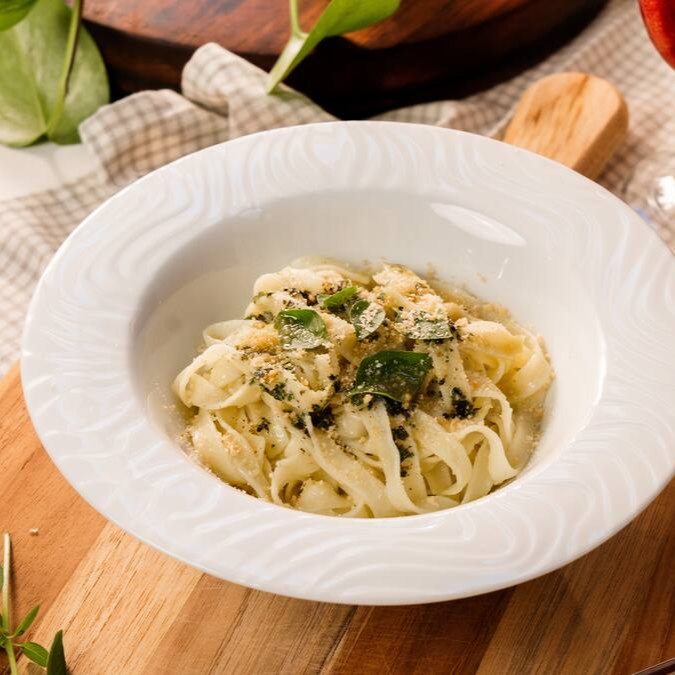 Massa fresca artesanal servida com um molho sugo tradicional, oferecendo um sabor autêntico e reconfortante. Alimento livre de glúten e leite animal. Sem contaminação cruzada.