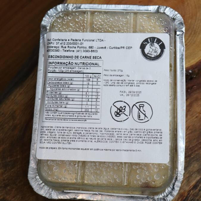 Carne seca desfiada coberta com purê de mandioca, gratinada ao forno, oferecendo um sabor tradicional e reconfortante. Alimento livre de glúten e leite animal. Sem contaminação cruzada.