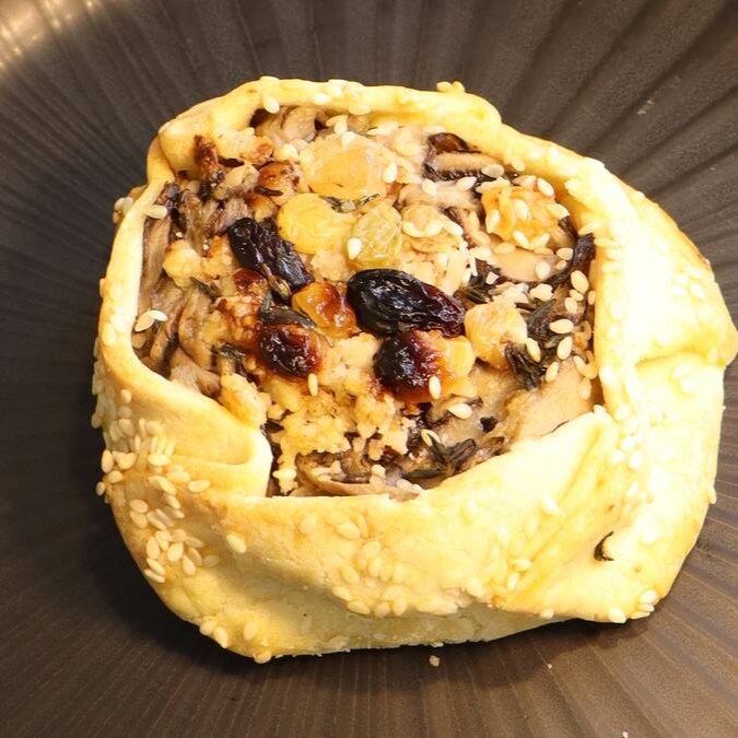 Torta rústica com ricota de castanha de caju, shitake orgânico e castanhas do Brasil, finalizada com uvas-passas.