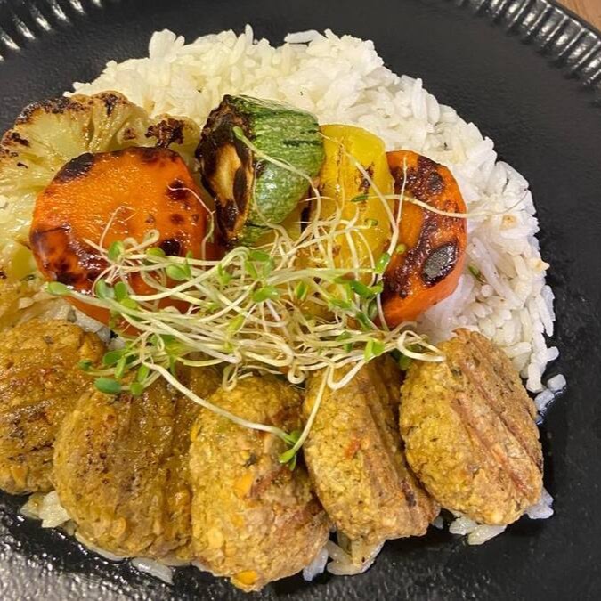 Arroz soltinho, feijão bem temperado, salada, legumes e falafel crocante 125g. Alimento livre de glúten e leite animal. Sem contaminação cruzada.