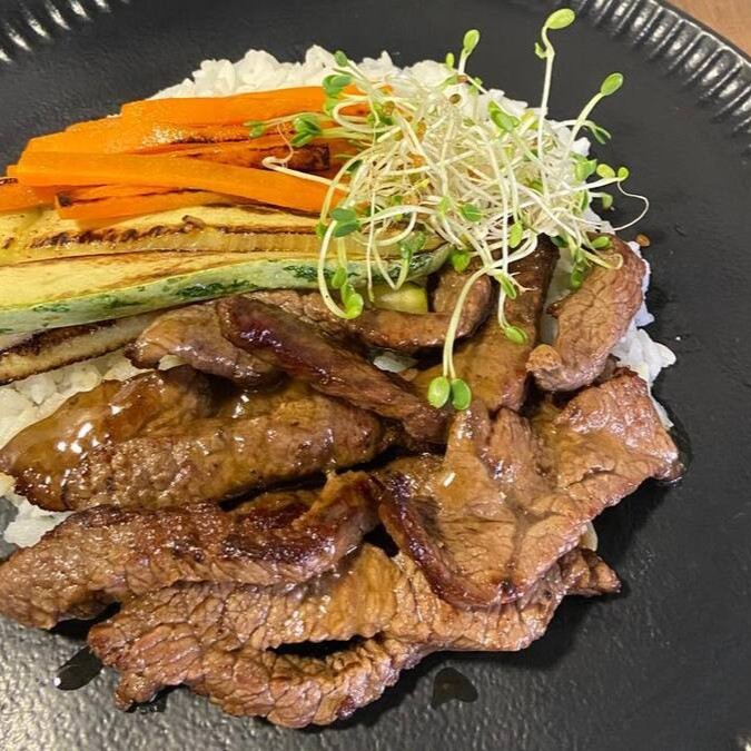 Arroz macio, feijão, salada fresca, legumes e carne vermelha suculenta de 130g. Alimento livre de glúten e leite animal. Sem contaminação cruzada.