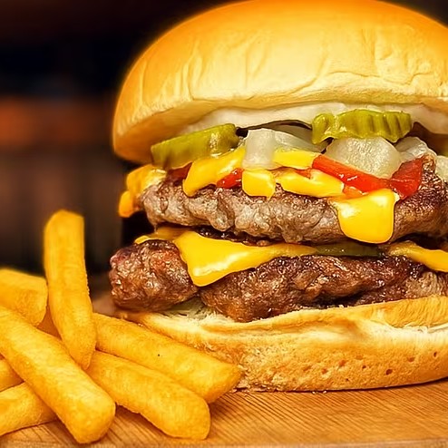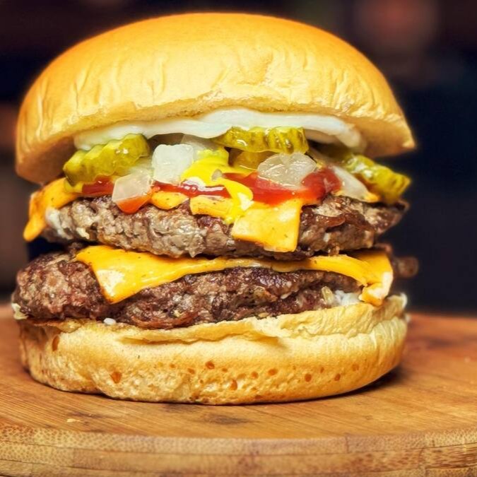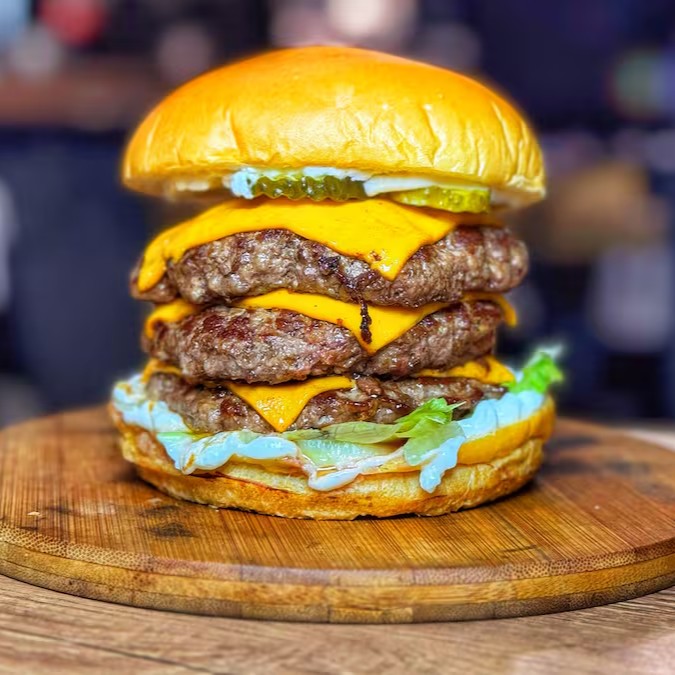 Pão brioche, 3x hambúrguer 150g, queijo cheddar, alface e picles.