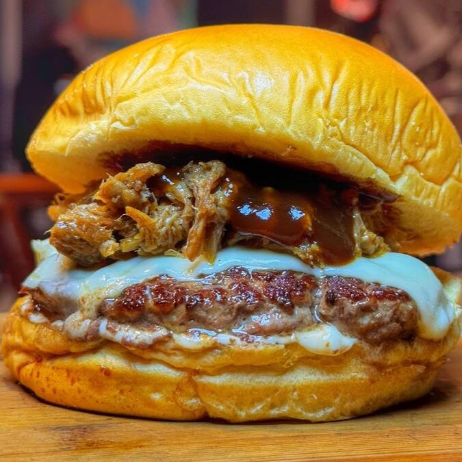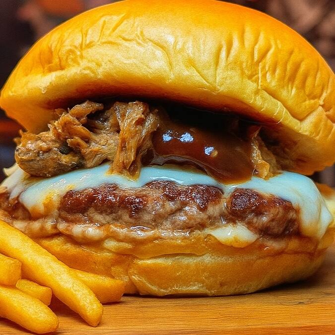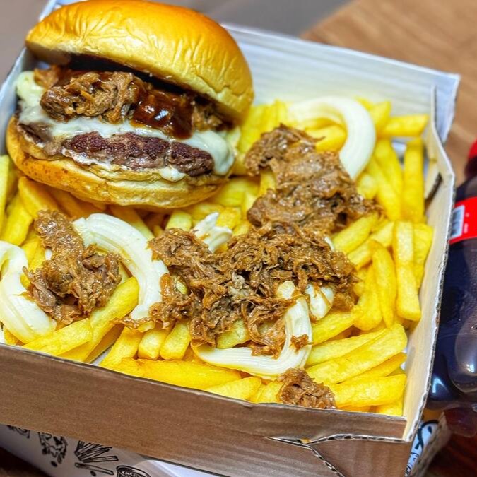 Pão brioche, hambúrguer 150g, queijo mussarela, costela desfiada e barbecue.
