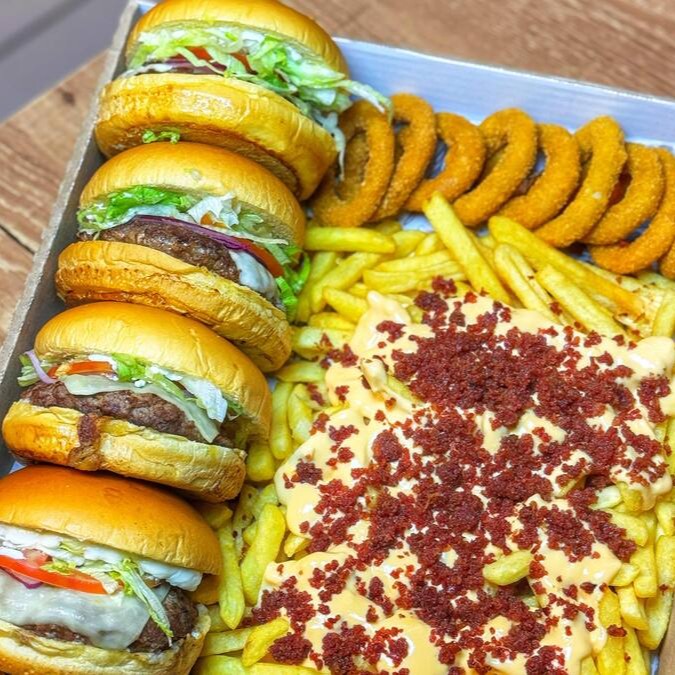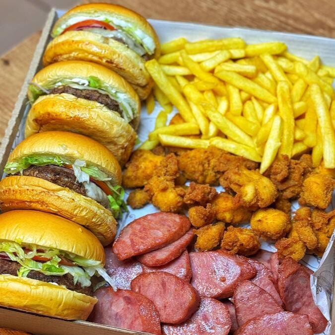 3 Supreme Cheddar, 1 batata com farofa de bacon e cheddar, 6 anéis de cebola + 1 Guaraná 2 Litros