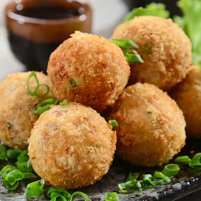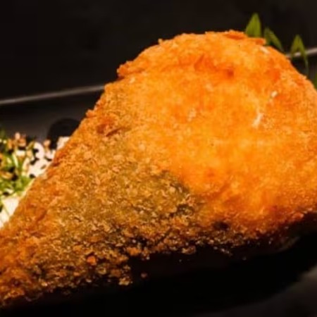 Delicioso bolinho empanado de salmão. Acompanha molho de geleia de pimenta.