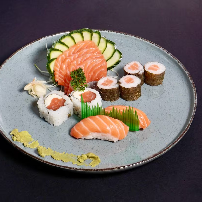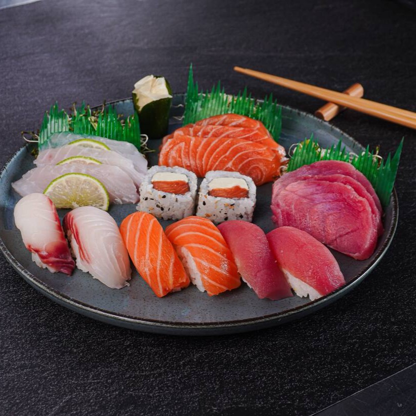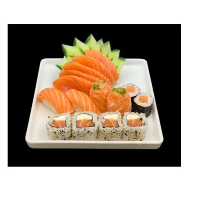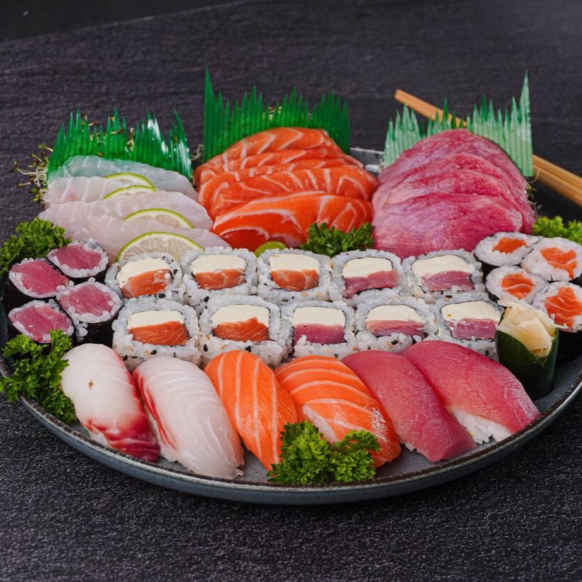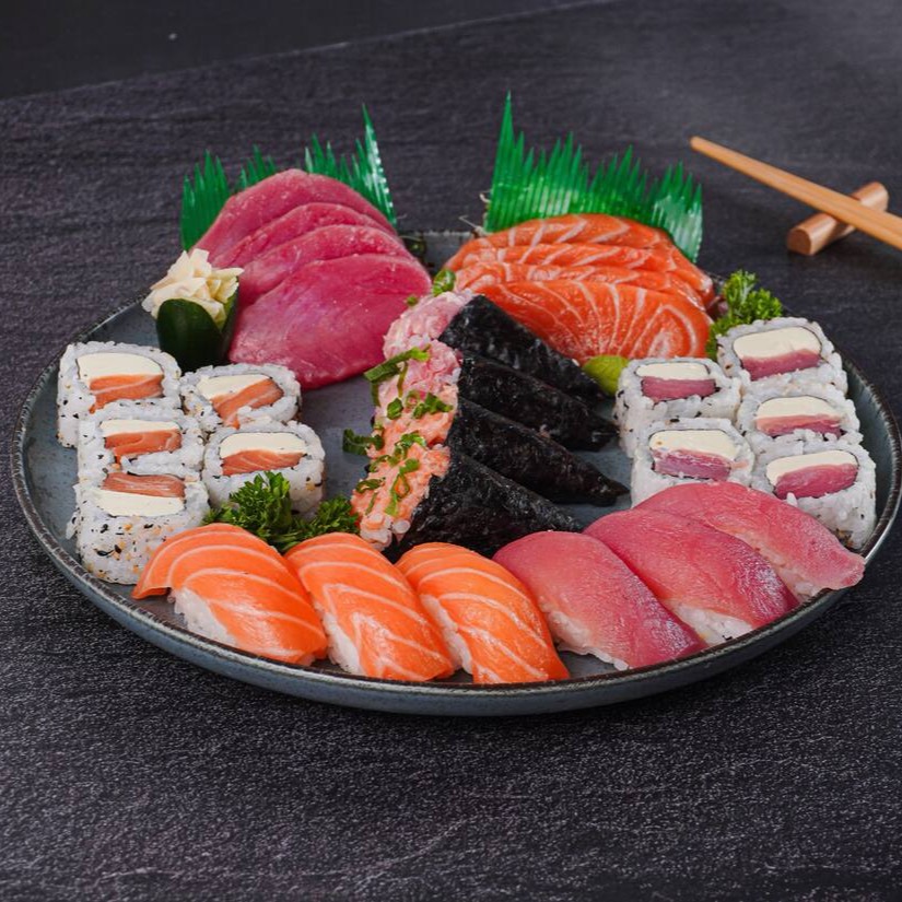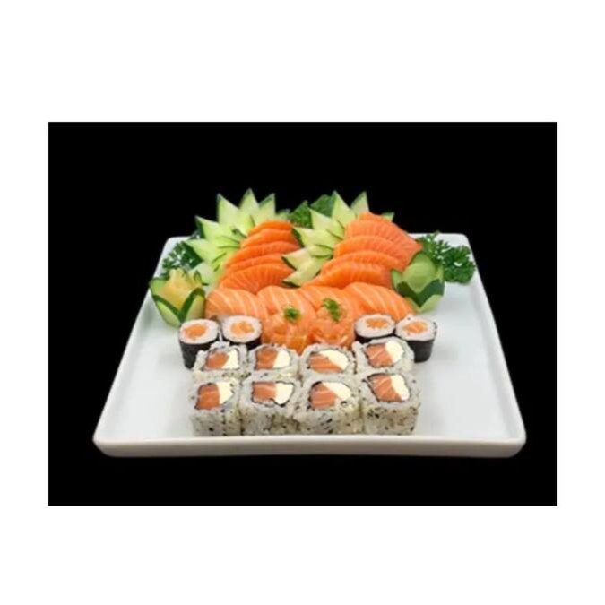 Um combinado irresistível de 4 sashimi de salmão, 4 sashimi de atum, 4 sashimi de tilápia, 5 uramaki filadelfia, 5 uramaki atum, 4 hossomaki de salmão, 4 teka maki de atum, 2 niguiri de salmão, 2 niguiri de atum, 2 niguiri de tilápia