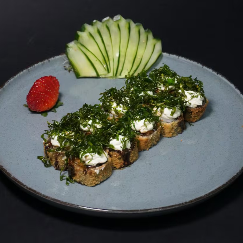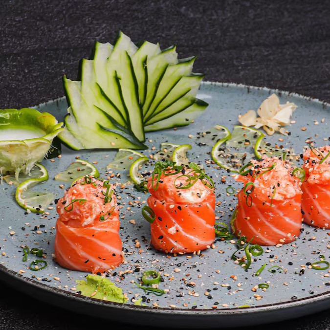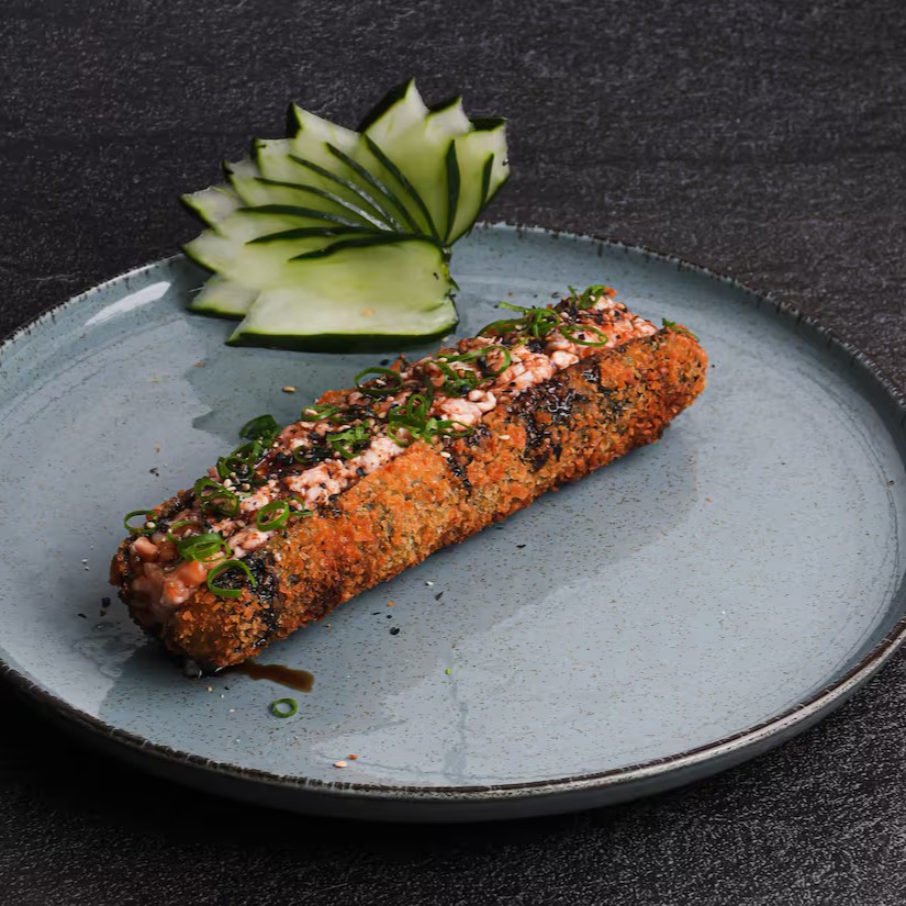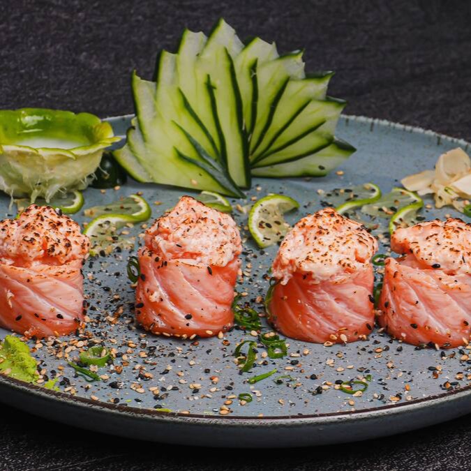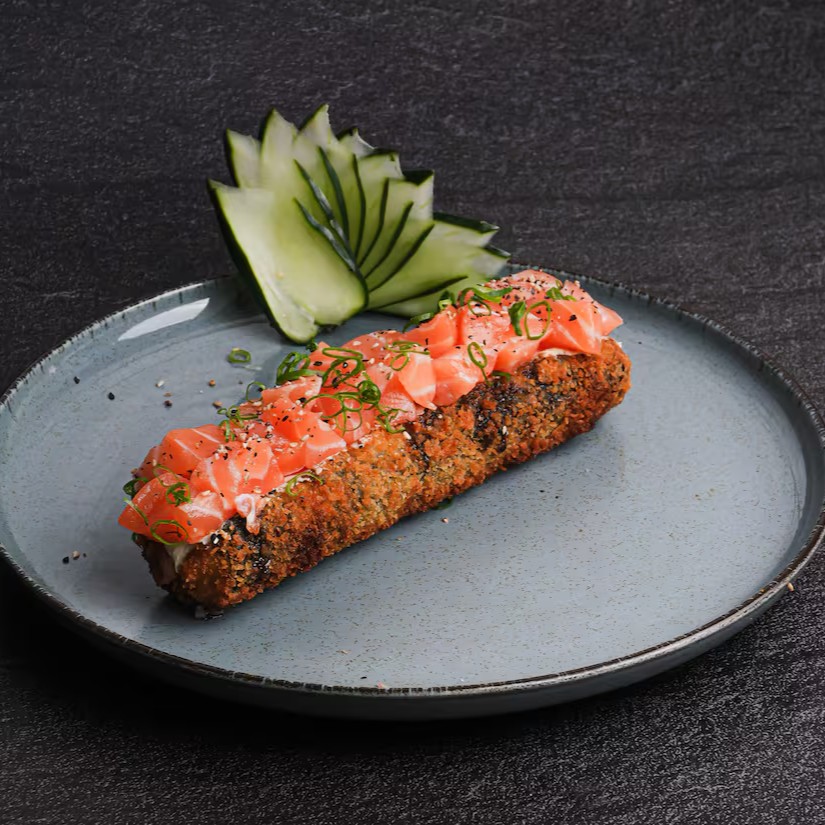 Sushis enrolados e quentinhos, recheados com salmão e cream cheese. Finalizados com cream cheese cremoso e couve crocante por cima.