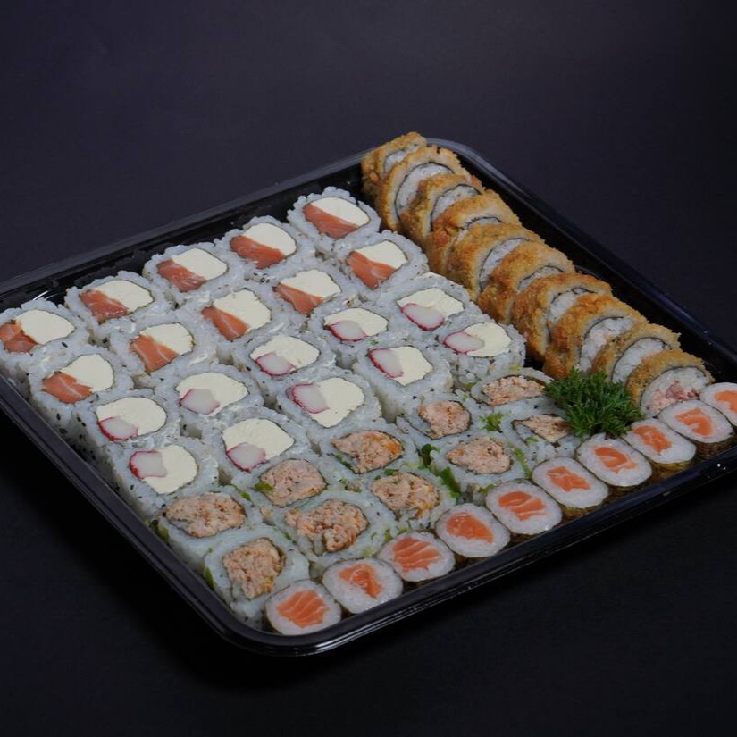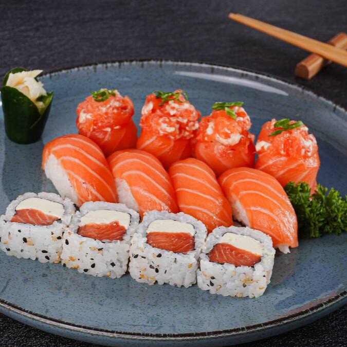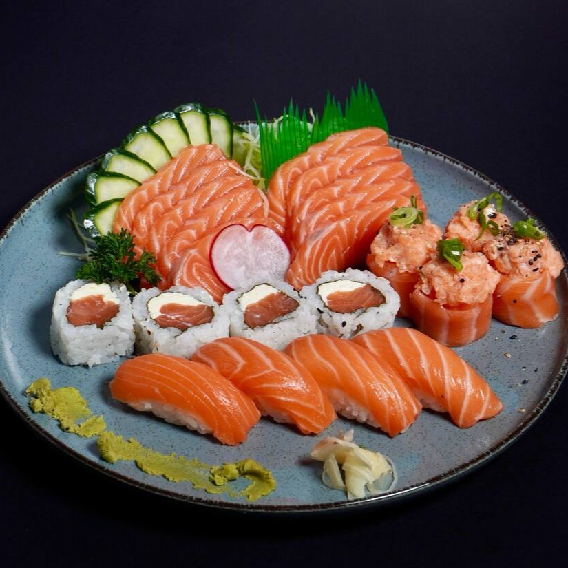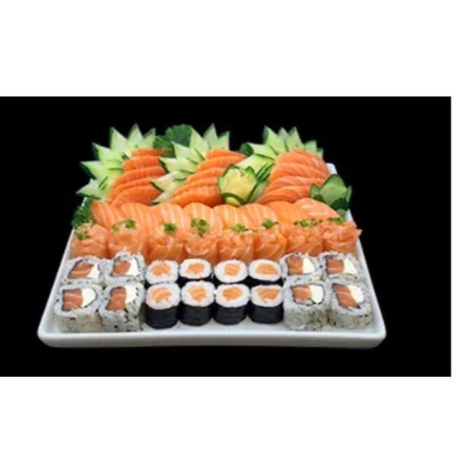 Delícia garantida com 10 sashimi de salmão, 10 uramaki filadelfia, 10 uramaki Filadelfia especial, 8 hossomaki de salmão, 8 niguiri de salmão e 8 joe de salmão.