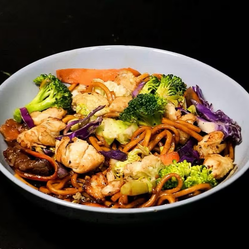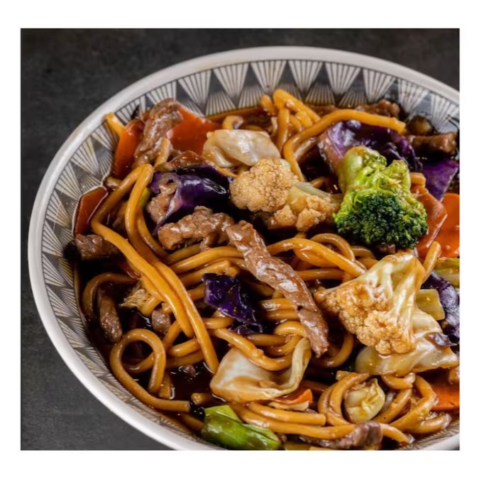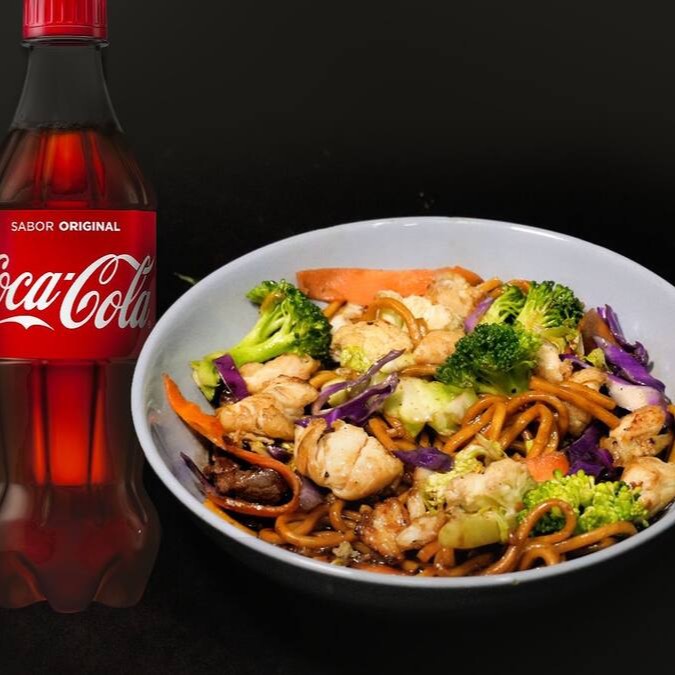 Yakissoba Tradicional: macarrão oriental com carne, frango e legumes frescos e salteados (acelga, brócolis, cenoura, couve-flor, repolho verde e roxo), finalizado com molho especial. Para completar, acompanha 1 Coca-Cola Original 350ml.