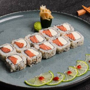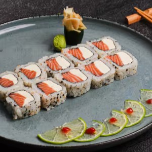Deliciosas peças de 5 sashimi de salmão, 2 niguiri de salmão, 2 joe de salmão, 2 hossomaki de salmão e 4 uramaki Filadelfia.