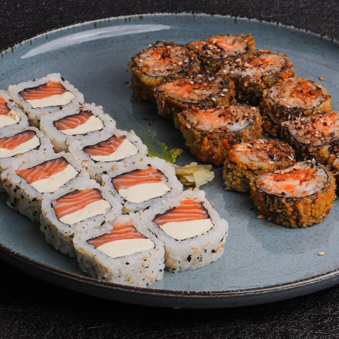10 unidades de hot filadelfia (sushi enrolado e recheados com salmão e cream cheese, acompanha molho tarê e gergelim) + 10 unidades de uramaki filadelifa (salmão e cream cheese).