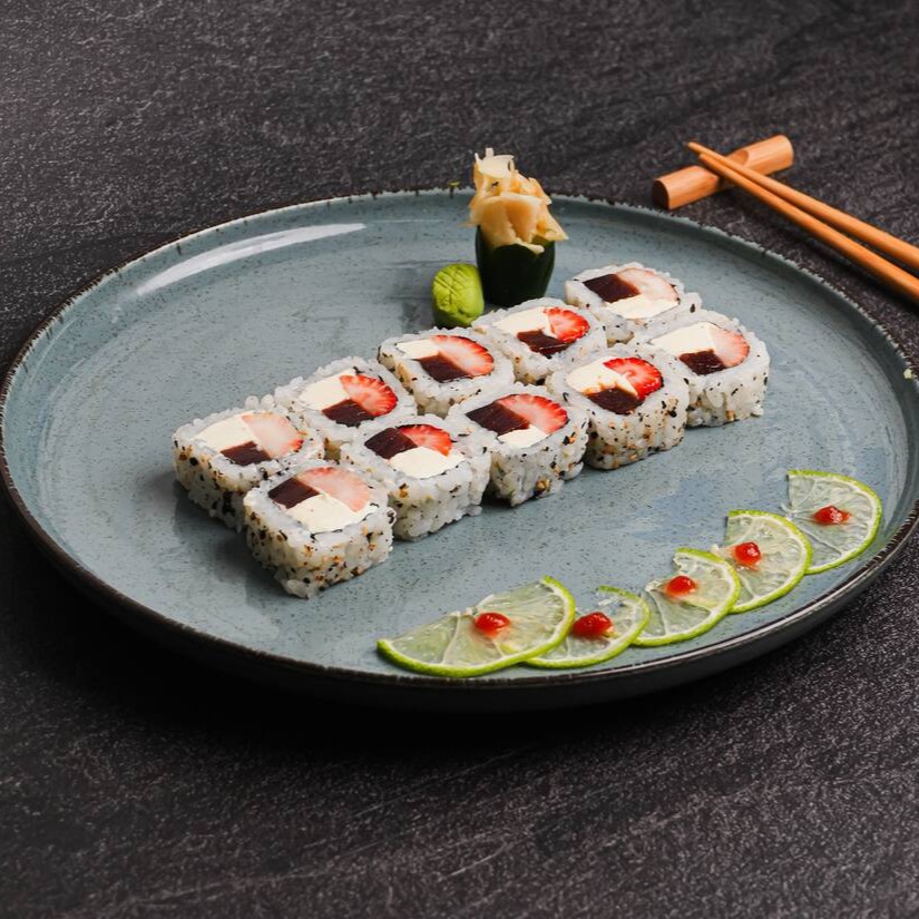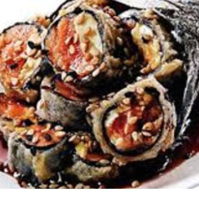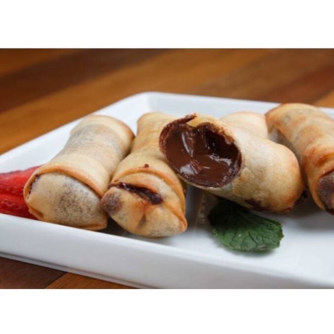 Sushis empanados na massa harumaki e quentinho, recheado com brigadeiro artesanal. Cobertura de chocolate preto e morango fresco.