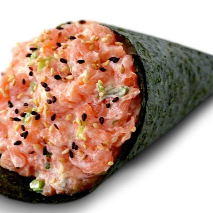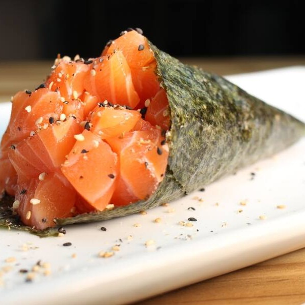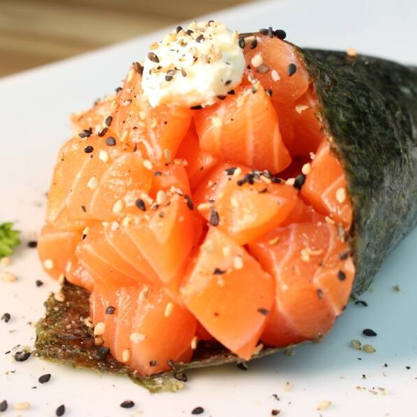 Temaki em forma de cone, recheado com cubos de salmão fresco, cream cheese e arroz, finalizado com gergelim. Serve 200g.