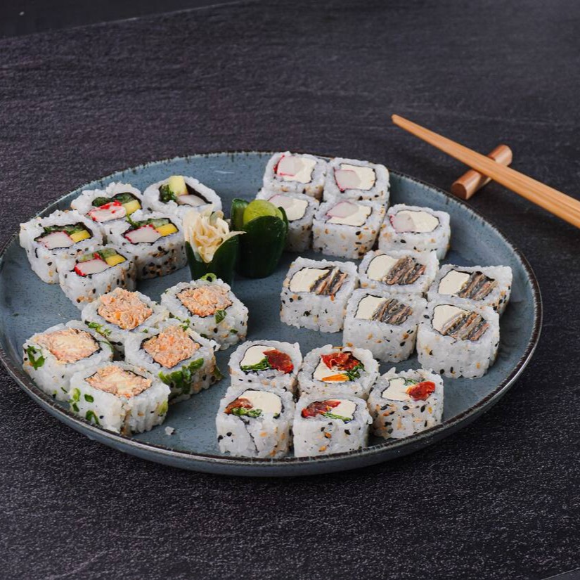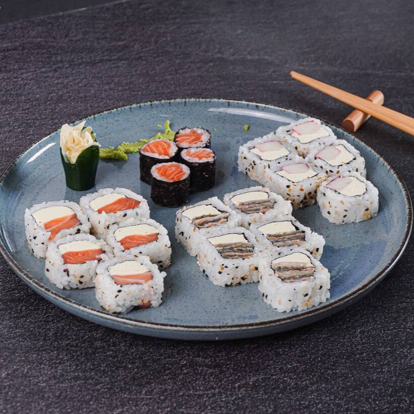 Deliciosa variedade: 10 hot Filadélfia com molho tarê, 8 hossomaki de salmão, 4 joe de salmão, 4 niguiri de salmão, 4 niguiri de salmão skin, 5 uramaki kani com cream cheese e 5 uramaki skin com cream cheese.