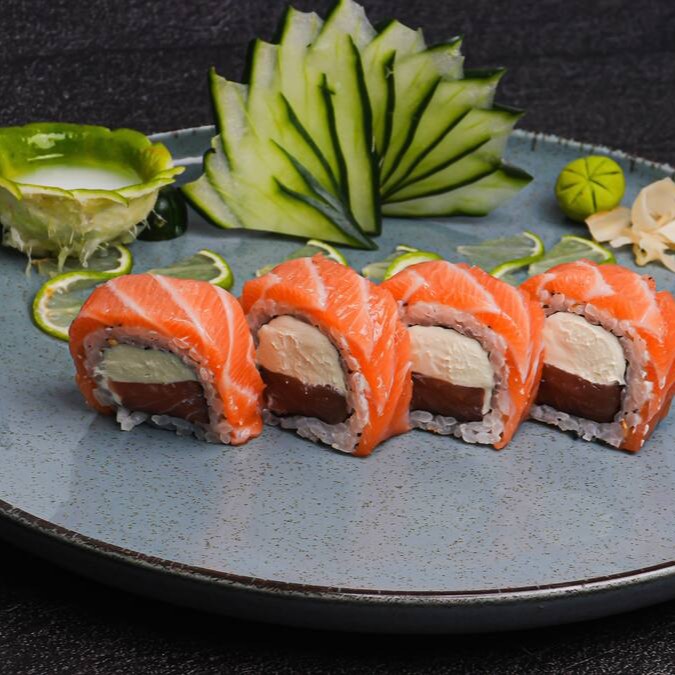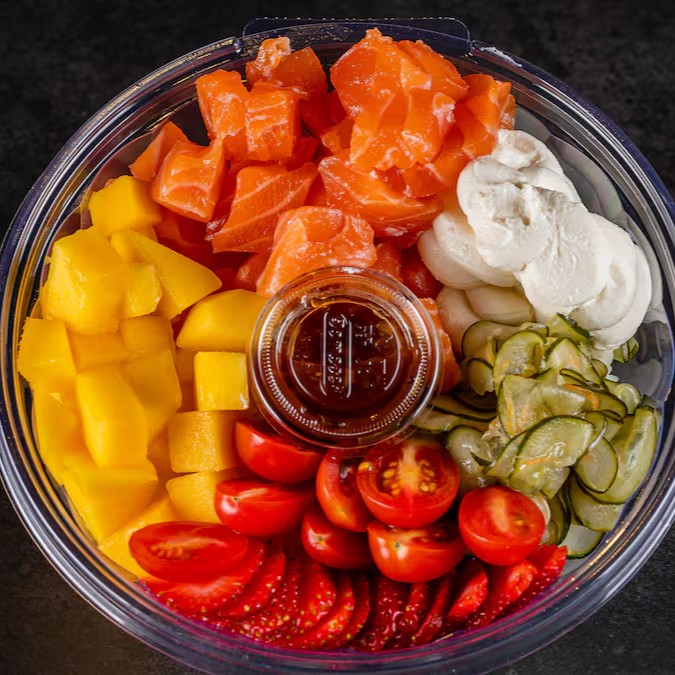 Cubos de salmão (100gr), cream cheese, sunomono, tomate cereja e manga. Delicioso arroz shari (130gr) e finalizado com gergelim salpicado, cebolinha e um toque de molho de ostra.