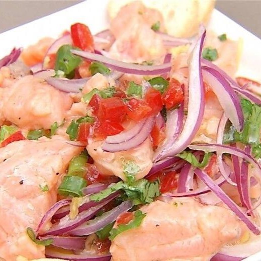 Delicioso salmão em cubos marinado em suco de limão e laranja, azeite de oliva, cebola roxa, tomate cereja, pimenta dedo de moça, ajinomoto e hondashi.