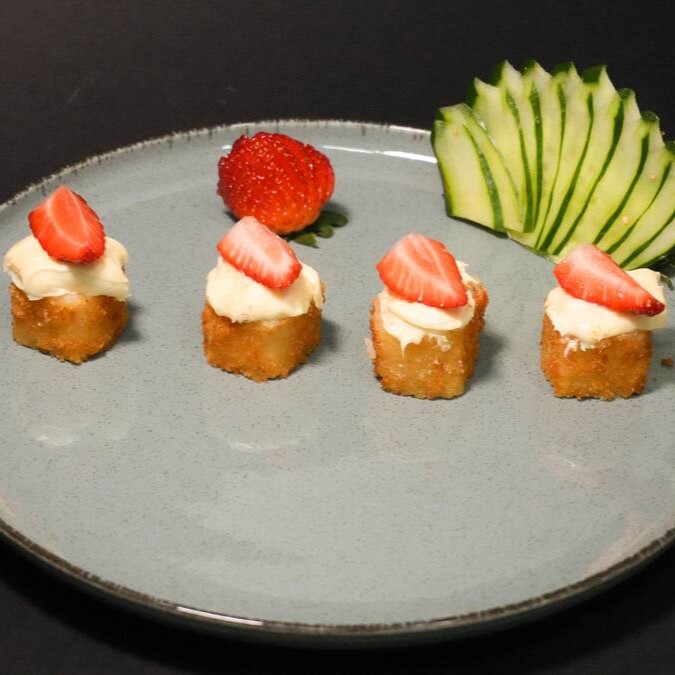 Sushis empanados na massa harumaki e quentinho, recheado com brigadeiro artesanal. Cobertura de chocolate branco e morango fresco.