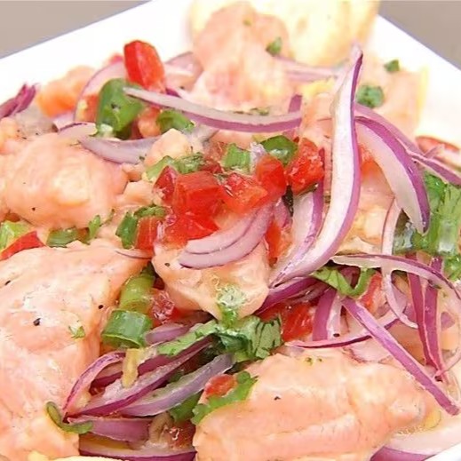 Salmão e peixe branco em cubos marinado em suco de limão e laranja, com azeite de oliva, cebola roxa, tomate cereja, pimenta dedo de moça, ajinomoto e hondashi.