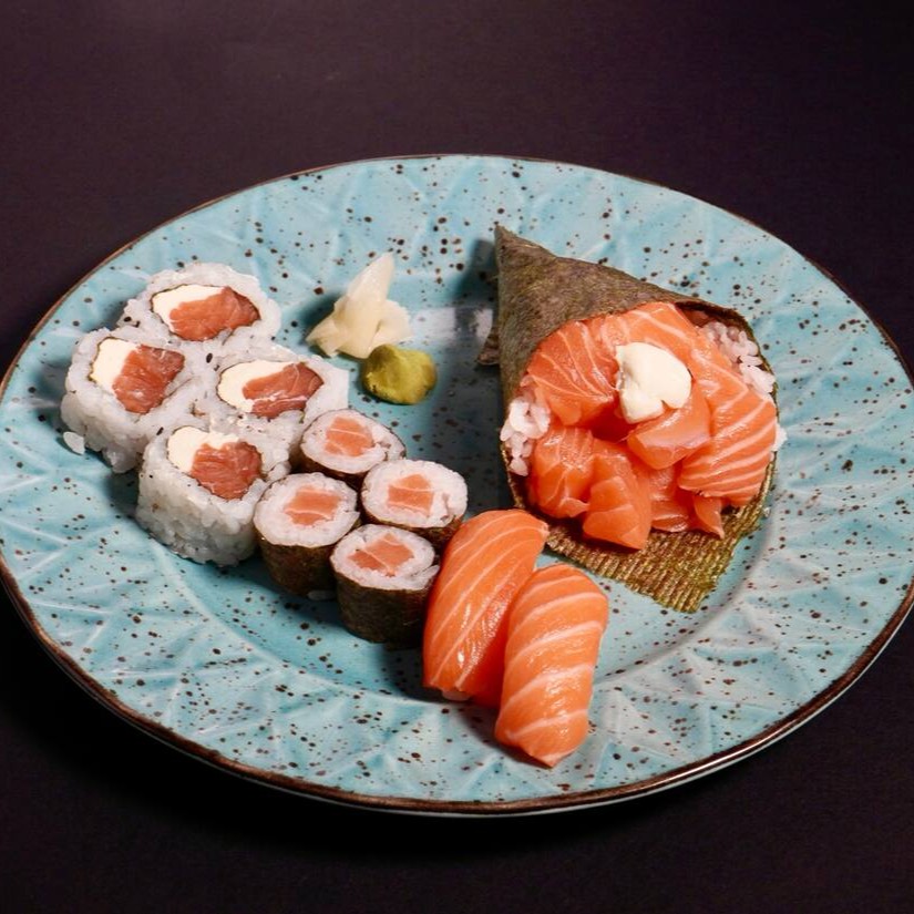 Perfeito para uma pessoa ou para compartilhar: 4 sashimis de salmão, 4 hossomaki de salmão, 2 uramaki Filadélfia e 2 niguiri de salmão. Acompanha gengibre e wasabi para completar o sabor.