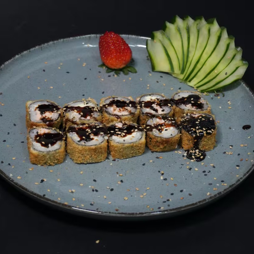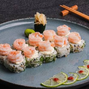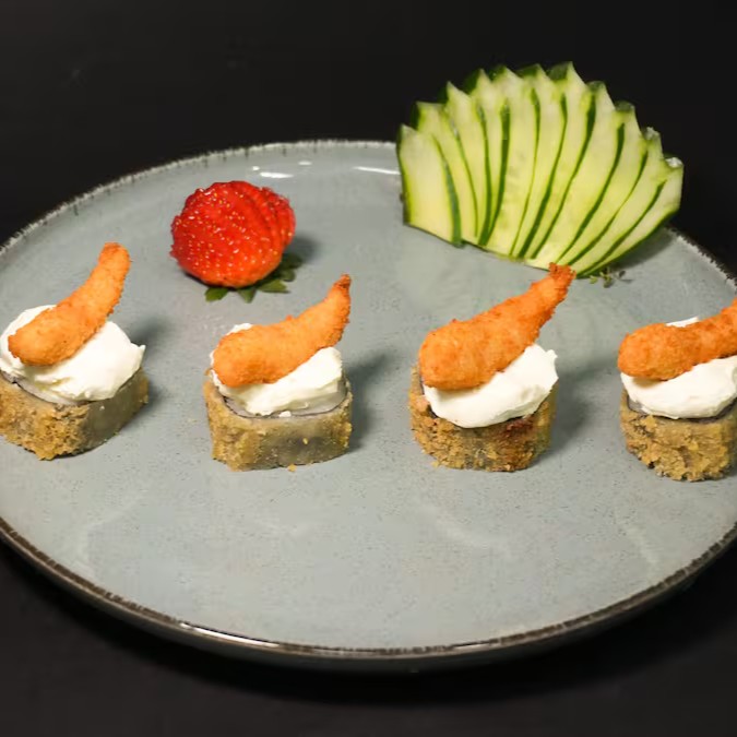 Sushis enrolados e quentinhos recheados e cobertos com camarão e cream cheese cremoso.