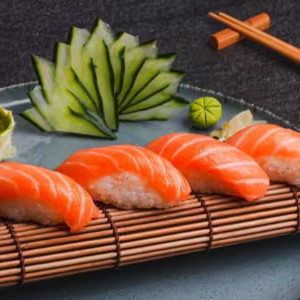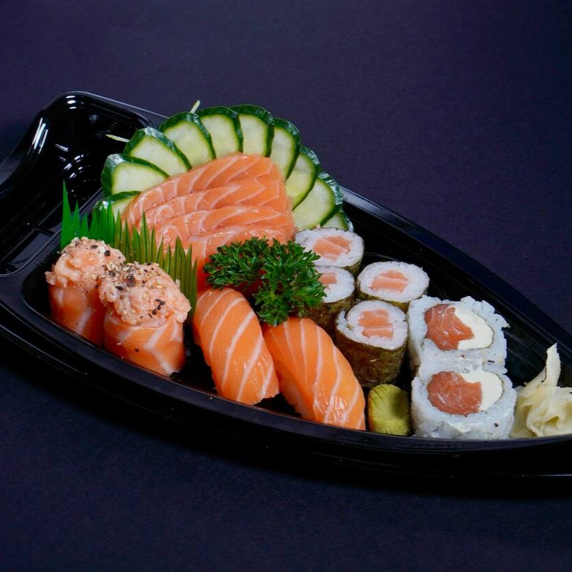 Deliciosa barca especial de salmão! Vem com 4 sashimis de salmão, 4 hossomaki de salmão, 2 niguiri de salmão, 2 joe de salmão e 2 uramaki filadelfia.