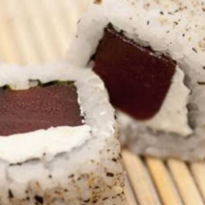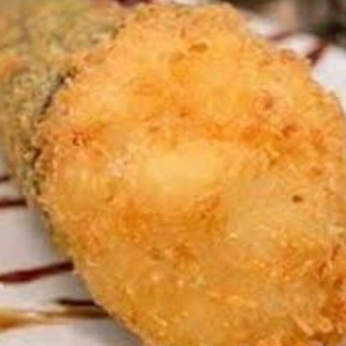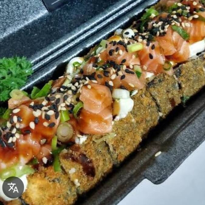 Sushi recheado com patê de salmão, creme chese, cebolinha, frito na panko