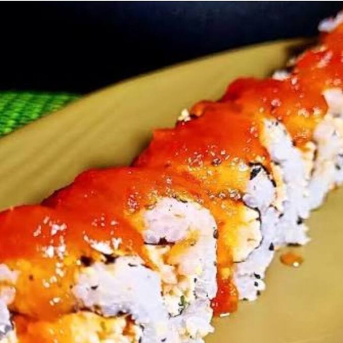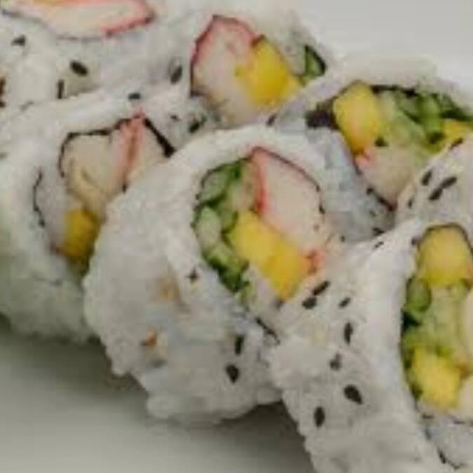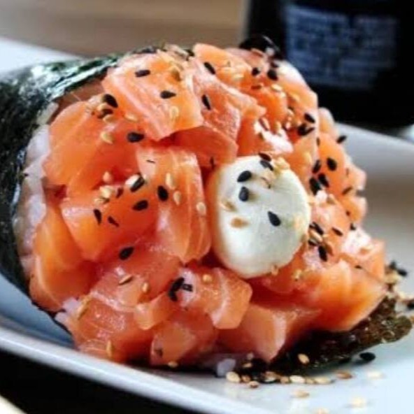 Arroz japones,Salmão em cubos,manga , pepino japonês, creme chese, kanikama e gegilim